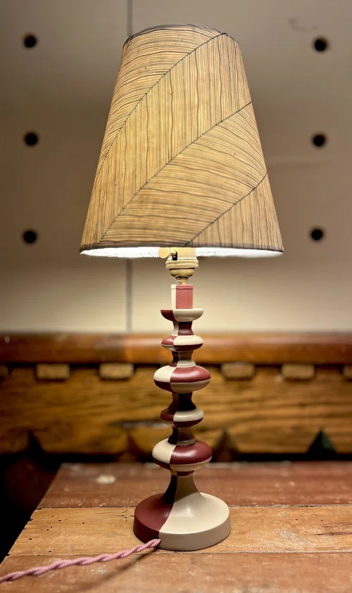 My lamps are sourced second-hand; from our home, friends, and neighborhood thrift stores. I deconstruct and reassemble them, changing wiring, shades, and bases. Bases are painted, sanded, shortened, or extended. Shades are woven, sewn, re-carded with fabric and fusible interfacing, or with paper and papyrus.